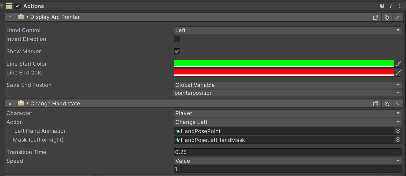 Each of these line renderers can be added to the left and/or right hands and configured using VR Actions. Each of them can also have a Marker at the end of the line. This can be a marker of your choice and is changed by updating the prefab. The Laser and Arc pointers has similar Actions. The hand control can be set, and for the Right Hand, you will need to check the invert box. The colors can be set, and the End position cab be saved to a variable. This is needed if you want to teleport the Player or move a game object. See the Basic IK example scene for how this is configured.