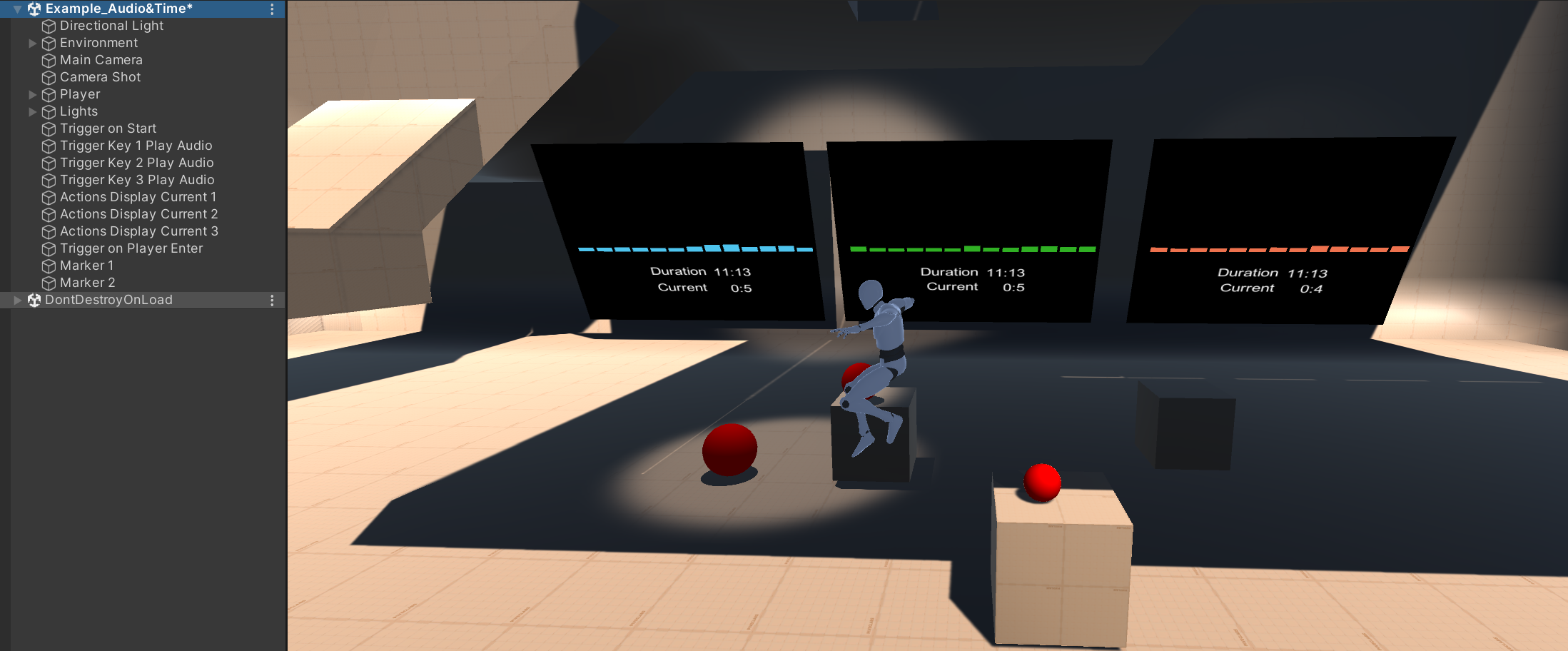 The Audio and Time example displays the Audio Visualizer Component in three places on three different World Space Canvases attached to three different GameObjects. Each GameObject has an Audio Source attached.