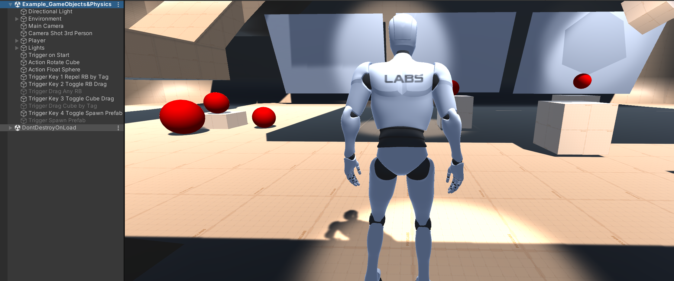 In this scene we demonstrate the use of the Drag Instructions and interact with Rigidbodies. We also show how the Spawn Game Object is used.