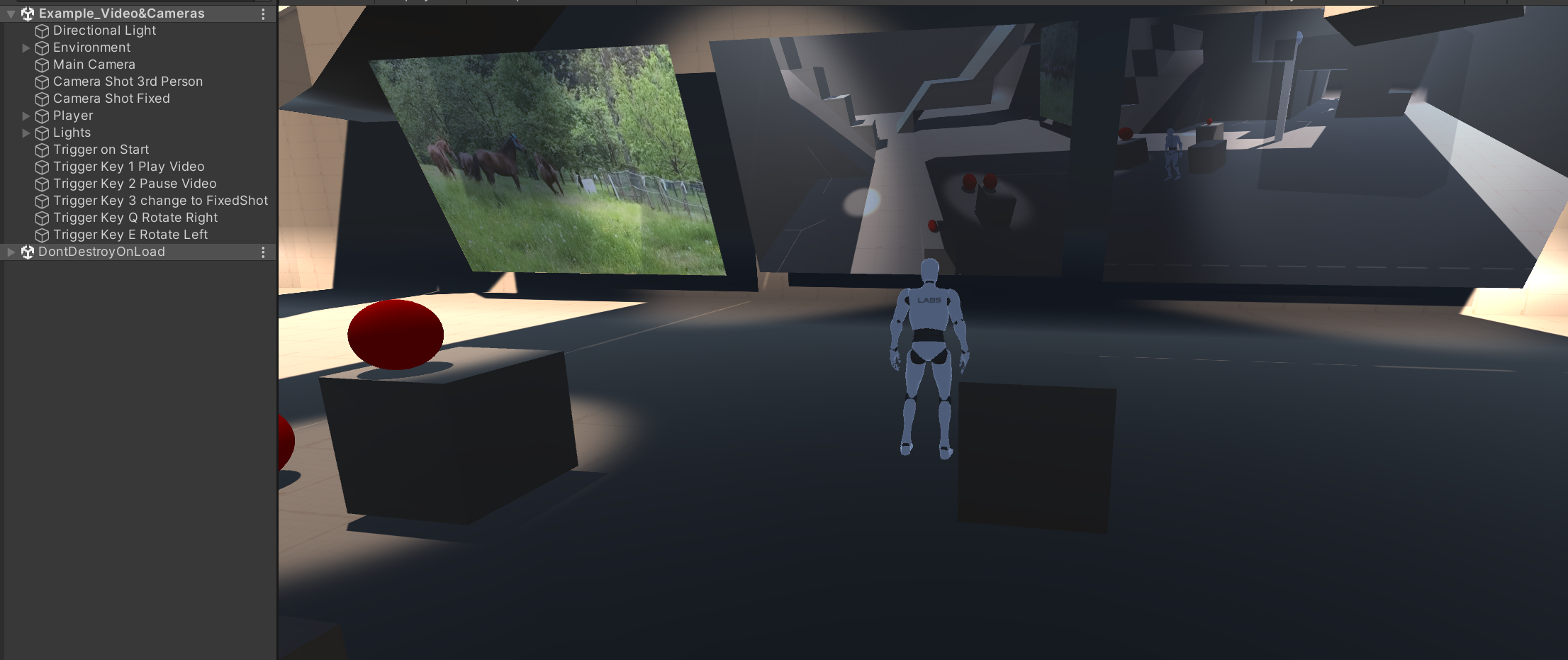 For our last example, we demonstrate the use of Cameras and Video on an Object. We have two Camera Shots (were called Camera Motors in GC1) defined, a 3rd person (was Adventure Camera) and a Fixed Camera. We start with the 3rd person and use the on Key down 3 to change to the Fixed. We have not defined a Trigger to switch back, but you can do this easily by either duplicating this one and reversing it, or if you are more adventurous, by creating a condition.