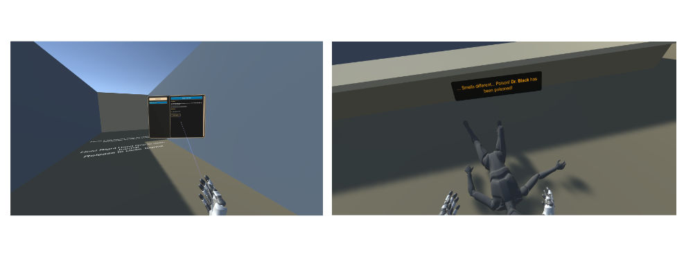 The Left Hand Grip will open the Quest Hud, which is attached to the Left Hand Follower. On release of the Grip, the Hud will close. Similar to this, the Quest Journal will open on press of Right Hand Grip, and close upon release. The UI pointer is automatically display and the Trigger will interact with the UI elements.