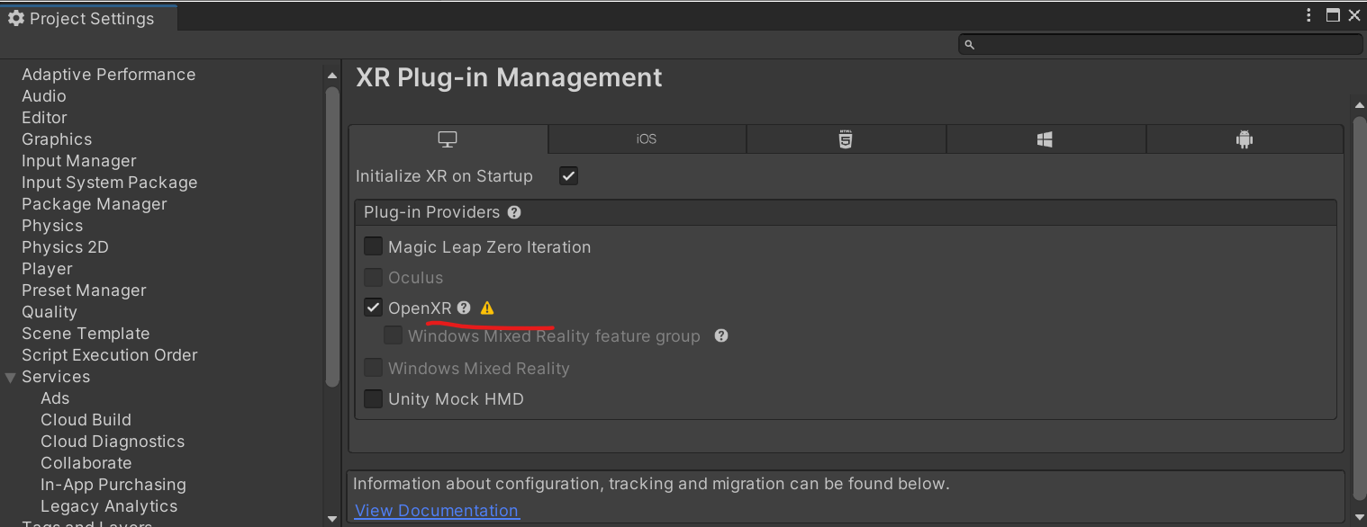 For this section we will use is the HTC Vive. This works similar to the Valve Index and even uses the VR Steam runtime from Valve to connect to the PC. Follow the setup instructions from Vive to connect and configure you Headset. For Steam VR, you will need a Steam account and need to install the latest version on Steam on your PC. The link for further information is at the bottom of the page. Back in the player settings, locate the XR Plugin Management. Select the Desktop tab and select OpenXR.