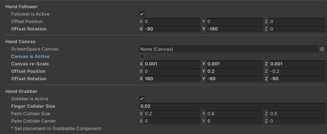 The important parameters at this stage are the Hand Follower Offset Rotation, and the Hand Grabber Collider size. The Offset Rotation is needed to align the Character Hands with the VR Controllers, and if the Colliders are too big, they will not allow you to Grab any objects. The above graphic is for the Left Hand, and the below graphic is the Right hand. You will notice that the Rotations are inverted, but this will not always be the case.