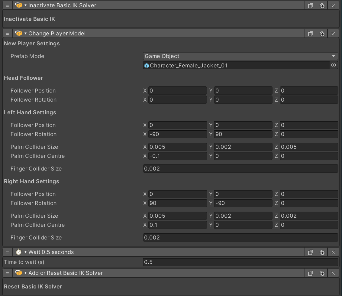 For this Model we needed to change both the Follower Rotations AND the Collider sizes. To do this at runtime, you should create the following Actions. Firstly you need to Inactivate the Basic IK or Final IK if you are using that. Next call the Change Player Model Action and copy the settings shown. This Action will set both Left and Right Hands as well as the Head if needed.